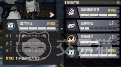 当大家拿到这个出力模组之后,就可以将他装备到机甲上,之后大家会看到机甲的出力增加了,比起原先增加了25点。如果大家觉得25点不够用的话,就可以给该模组升级,每次升级都可以增加25点,最高可增加100点。