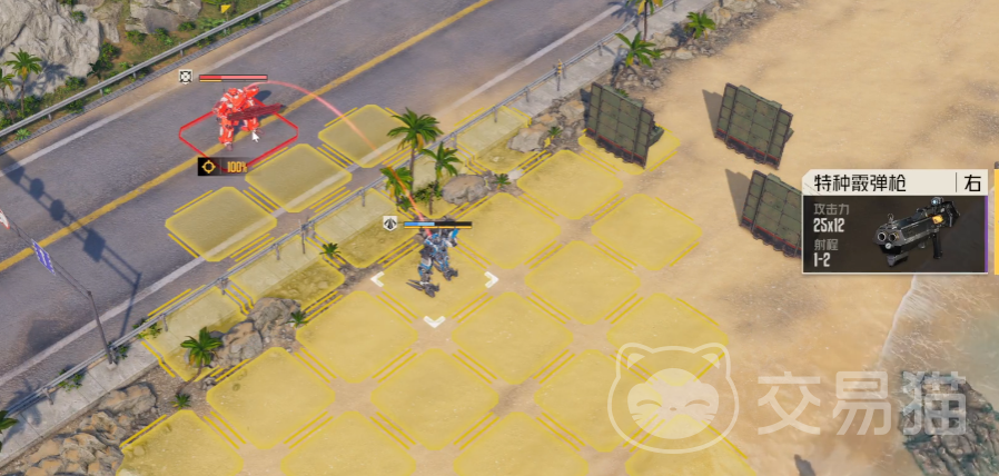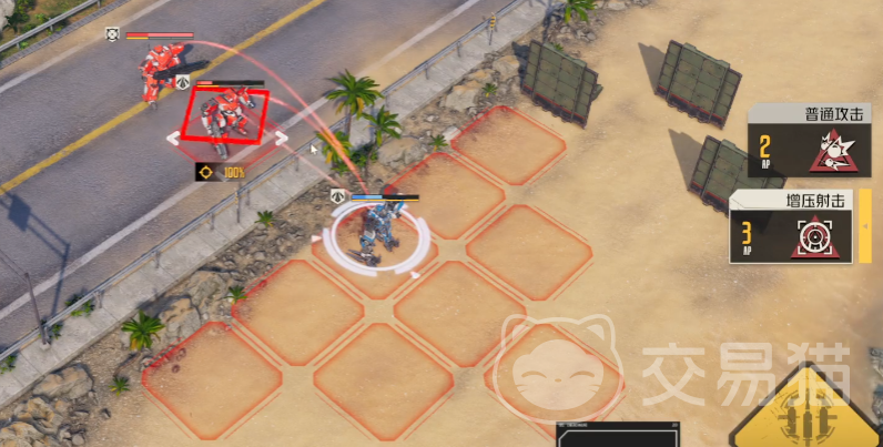 这一关需要玩家在4回合内击败所有的敌人。首个回合,移动到如图所示的位置,使用3AP的增压射击来攻击红框中的敌人,这样既可以打到其中一个敌人又可以凭借大树作为掩体来隔绝另一个敌人的攻击。