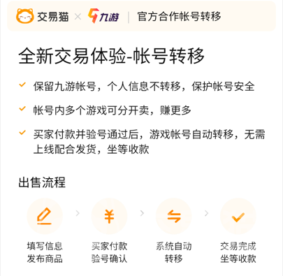 在上架奥特曼系列ol账号的过程中我们还可以选择多种特色的卖号服务以加快卖号的速度并且通过高强度的安全保障避免一些纠纷。如果大家用的是九游账号,推荐直接使用账号转移服务,这样就可以将这一款游戏中的数据转移到买家的账号中,对我们账号中其他游戏的数据不造成影响,而且明显会更加安全。在买家付款之后的转移工作是系统自动完成的,也不需要我们进行操作,大家坐等到账就可以了。