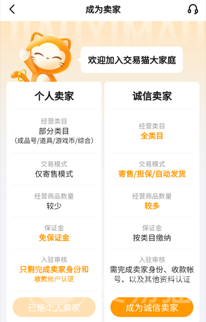 选择交易猫的原因之一就是对于个人卖家身份的获取相对比较正规和简便,大家需要做的就是在软件中上传相关的凭证并且绑定收款账户,系统审核的速度非常快,最关键的是个人卖家不需要我们缴纳保证金,还是比较亲民的,节省了不少成本。而且个人卖家可以同时上架多个商品,虽然也带有数量的限制,对于我们来说也足够使用了,非常给力。