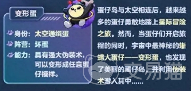 这一次的外星蛋入侵之后,大家在上面就可以查看到新出现的三个蛋仔,一个是变形蛋,一个是巡查蛋,还有一个就是研究蛋啦,在游戏中其实这三分蛋仔都是有不一样用途的,第一个变形蛋是属于一个坏蛋,在游戏中它也是被太空通缉的蛋,这个蛋有一个特别的能力,在游戏中是有强大的伪装术的,可以通过变形来模拟成为各种不同的蛋仔,这个能力可以让大家都找不到它。