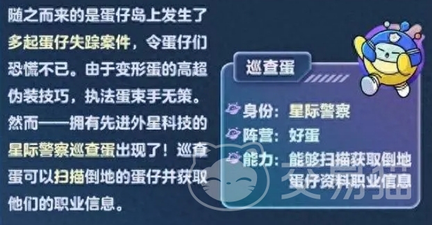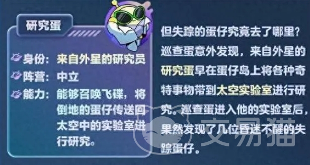 第二个但在就是巡查蛋仔它属于一个好蛋,在游戏中是代替了执法蛋出现的角色,在游戏中执法蛋已经没有办法抓到变形蛋的时候就可以用巡查蛋来代替啦,在游戏中只要是将对面的蛋仔给撞倒的话,就可以在上面将地上这个蛋仔的信息给扫描出来,这样的效果在游戏中其实是很好用的,最后一个研究蛋在游戏中是一个中立的蛋仔,在能力上面也比较特殊,使用这个蛋仔的话,在上面是可以通过上面大家能够召唤来的飞碟进行传送的效果,只要是倒在地上的蛋仔大家就可以通过召唤飞碟的方式将这个蛋仔给传送到研究室里面去进行研究。