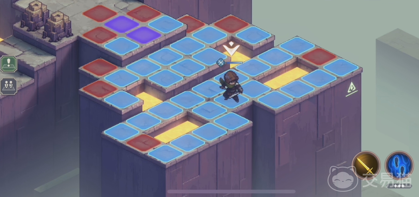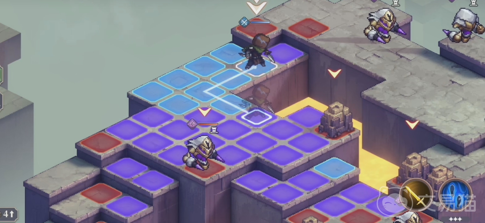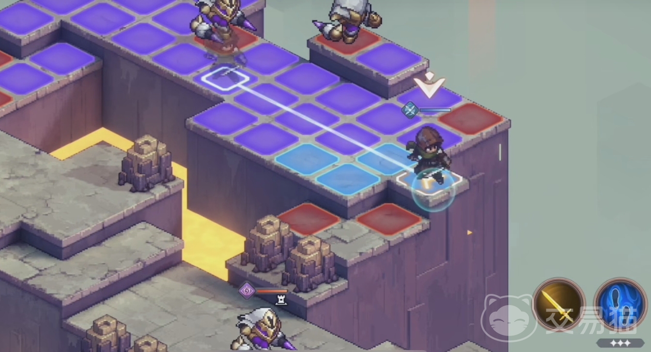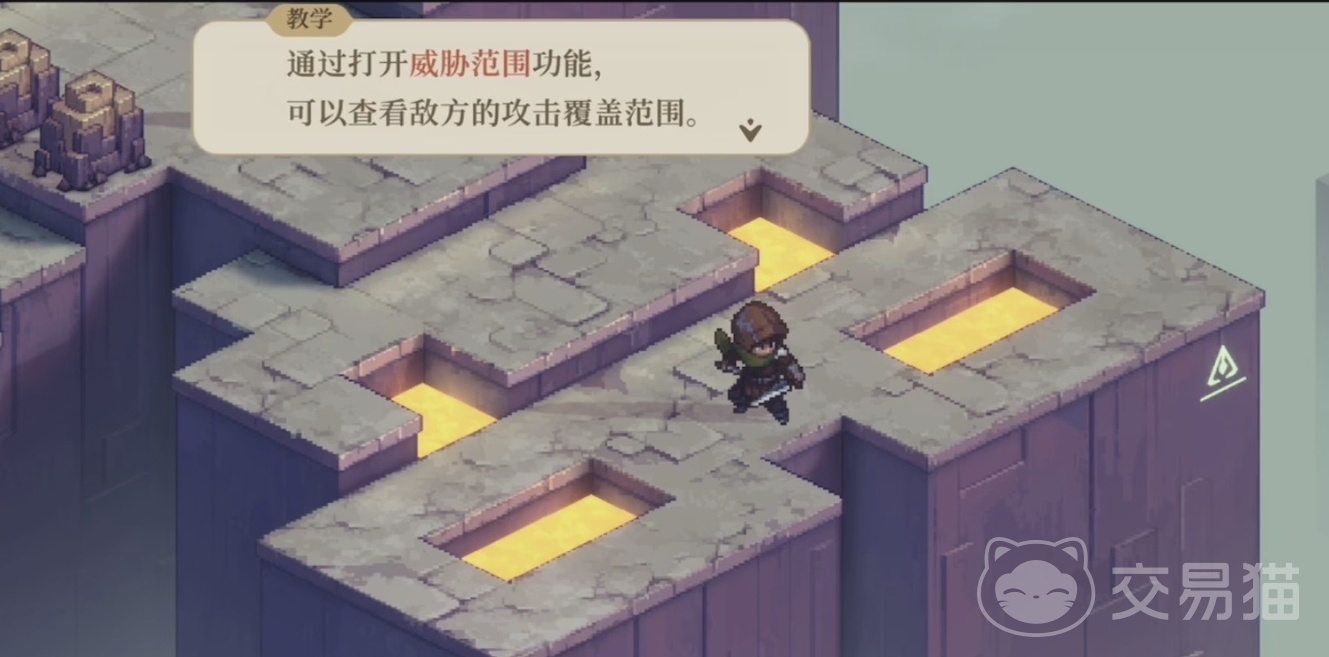 通关流程方面,首先根据教学的提示,打开威胁范围功能,在这里可以查看到敌方的攻击覆盖范围。如图所示,其中蓝色的便是我们前进安全的范围,而紫色则是危险攻击范围,人家们所要做的就是通过不断的进行走位来躲避这些巡楼守卫们的危险范围,最后,到达游戏的终点即可。