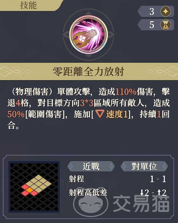 零距离全力放射,物理单体攻击,可对敌人造成高额伤害同时击退四格,对目标范围3×3区域的所有敌人再造成一段本次攻击50%的范围伤害,施加减速效果持续一回合。很好用的决定性必杀技能,高击退高伤害,还带有一定的范围攻击,非常推荐各位主加。