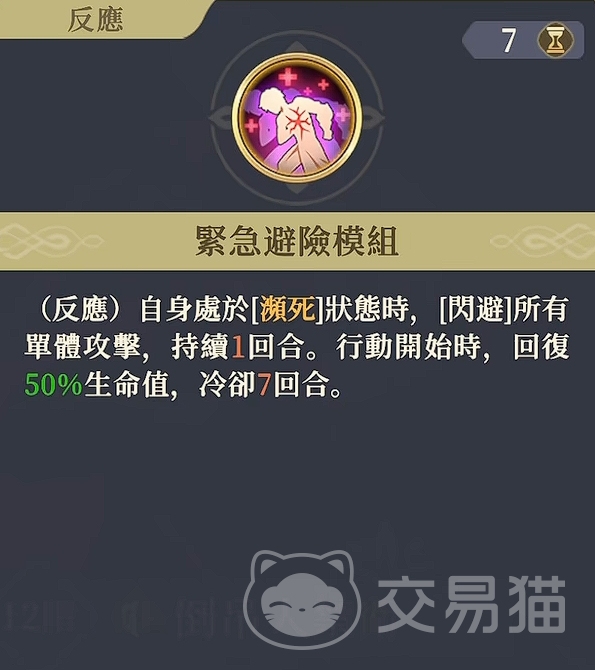 紧急避险模组,一个非常强大的保命技能。自身如果处于一个濒死状态之时,闪避所有攻击持续一回合,之后在行动开始时回复当前70%的最大生命值,技能总冷却七回合。简单来说,就是在自己平时状态下,相当于无敌一回合。同时,在下个回合开始回70%的血量,虽然冷却时间较长,但在紧急情况下,可以作为绝佳的保命技能使用。