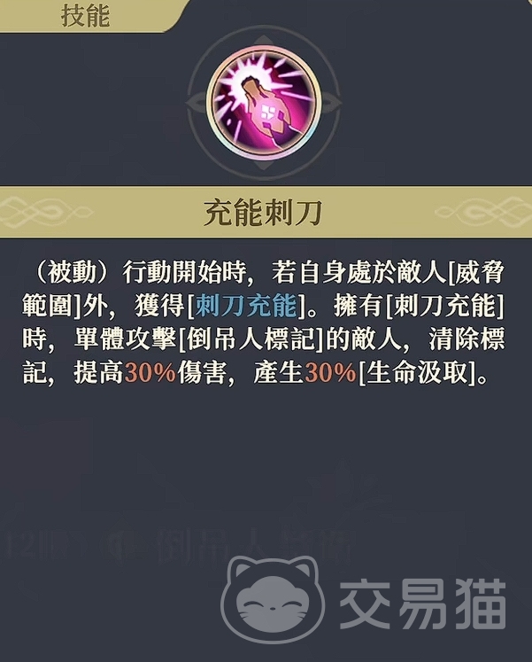 充能刺刀,与个性相呼应的一个强力技能,属于被动技能。在行动开始的时候,如果自身处于敌人威胁范围之外,则可以获得一层刺刀充能效果,拥有刺刀充能的时候,攻击带有倒吊人标记的敌人,则会清除标记,该次伤害提高30%。同时此次攻击还会获得30%的吸血。相当强大的一个输出型技能,自带吸血的效果能够让角色能有着更好的生存能力。