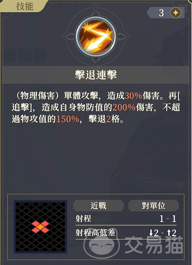 击退连击,物理伤害技能单体攻击,总共两段伤害。一段造成小幅度伤害之后自身获得追击效果,触发第二段可以获得自身物理防御高额加成且不超过自身物理攻击150%的输出伤害,并击退目标两个。还是很好用的,无论是用来补残血,亦或者是两段追击敌人,一定程度上缓解了角色行动方面的局限性。