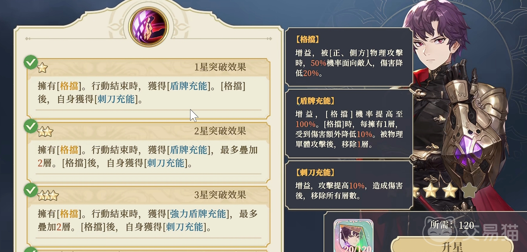 当格挡成功之后,自身还可以获得刺刀充能效果,简单来说,只要每格挡成功一次,攻击力会提高10%,在自己造成伤害之后,则会移除所有的刺刀充能效果,在角色四星之后,充能效果可以最多叠加两层。五星则是可以在首次格挡之后,让所有的技能冷却减一回合。