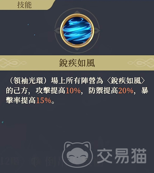 代表技能方面,第一就是他的锐疾如风光环,可以使场上锐疾如风阵营的友方攻击力提高,防御力提高,暴击率提高。非常好用,可以说,只要上场的话,那么该技能触发之后,便可以额外增加将近15%左右的输出属性,还能提高一定的生存能力。