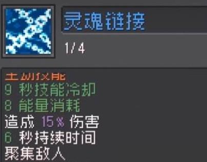 【灵魂锁链】主要是为了将敌人进行控制,在配合其他技能进行收割,这个技能在释放的时候,会在一个区域内召唤出一个链条,链条会框住敌人,让敌人没有办法动作,这样就更加的好清怪了!一个角色目前是只能携带四个技能的,这四个技能加点是大家要优先进行的!