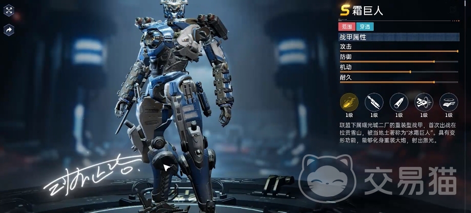 霜巨人这个机甲其实在游戏中主要在游戏中其实负责的是远程输出的效果,而且在防御效果上面是很不错的,大家可以在上面利用这个机甲的防御来抗很多的伤害,在前期大家去新的地图开荒的时候用这个机甲是最适合的,而且在游戏中这个机甲的火力说实话也是比较高的,生存能力不弱,前期培养起来之后大家也可以有一个特更好的保护机甲可以使用啦,在输出的时候它也可以直接变身成为一个有大炮的机器,所以看起来很酷炫。