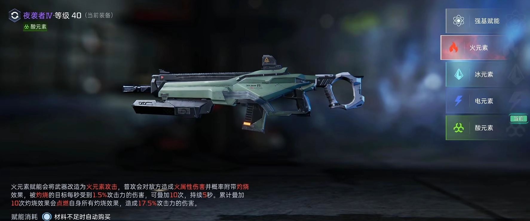 火元素:该赋能和上述三个元素一样,首先都会改变武器普攻的伤害属性,变成火属性伤害之后对抗部分感染体怪物时就会有更有成效的表现,另外它本身还有概率能够在敌人身上施加灼烧效果,这一效果它也是主打的持续输出,不过对比前文提到的酸元素,它会更加直接,只要挂上灼烧,敌人每秒都会掉血,虽然这个掉血量只能吃到主角1.5%攻击力的加成,但最多可以叠加十次,叠满之后更是会点燃所有灼烧,从而立即造成一次更高的爆发伤害!