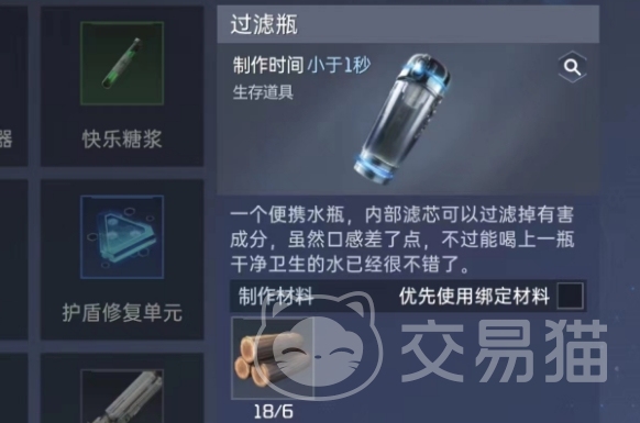 过滤瓶的获取也十分简单,只需要准备六个木材即可进行制作,制作完成后,找到一处河边,然后就会弹出喝水和装水两个选项,点击装水后,水就会被装进过滤瓶中,进入这个瓶子的水就会被过滤掉有害成分,也就是可以直接喝了。
