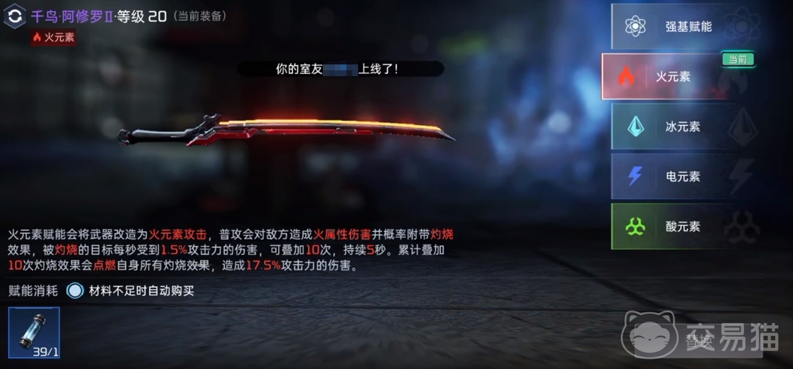 第一种推荐的赋能是“火元素”,这一元素的赋能下,你的千鸟会散发红色的灼热光效,并且它也能继承这一元素提供的特殊效果,不仅斩击的伤害会变成火属性,而且还有几率能够灼烧敌人,满十层的灼烧更是会瞬间点燃所有效果以此造成额外伤害。