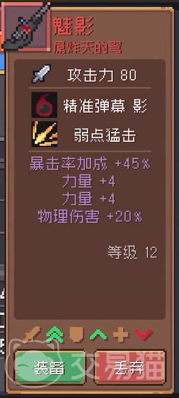 魅影:这是把远程武器,初始攻击力就高达80,而且还附加了许多增加伤害的词条,比如能够增加攻击的力量,又比如能直接增加输出上限的暴击率与物理伤害加成,另外它的两个技能也非常给力,精准弹幕影可以发射额外的弹幕对敌人造成属性伤害,弱点猛击则可以让你更快的进行单点秒杀。