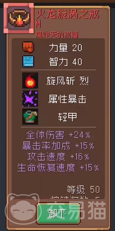 火龙旋涡之戒:这个戒指应该是最契合战士以及战士融合职业的饰品了,首先它在基础属性中有战士所需要的力量,羁绊方面,其独有的“旋风斩·烈”更是可以直接将战士技能中的“旋风斩”给转变为火焰属性的伤害,对于多数敌人来说,这类型的伤害将会显得更加具有威胁。