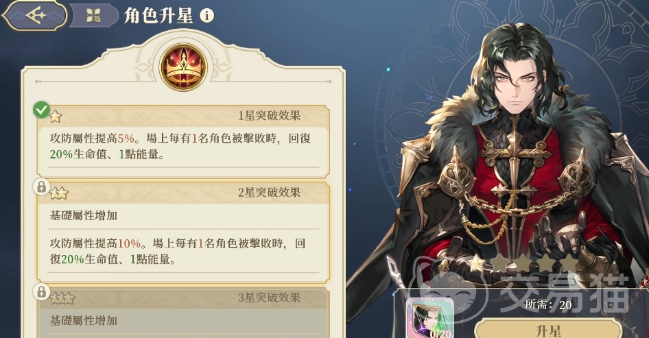 这个角色个性技能是一个攻防属性都有部分增益效果的技能,可以带来多种加成的效果,在1到4星的时候,其实它的功能属性提高百分比不太多,最高的时候也只能达到5%的攻防属性提升,但是如果场上有一名角色只要是被击败的话,他都是可以给自己带来回血效果的,并且最多的时候是可以达到30%的恢复效果,在五阶的时候,这个生命以及攻防属性的晋升百分比则是达到了5%,这个时候就算被击败,那么恢复的生命值也会有相应的提升,提升到了35%的数值,会比前面恢复数值好用很多。