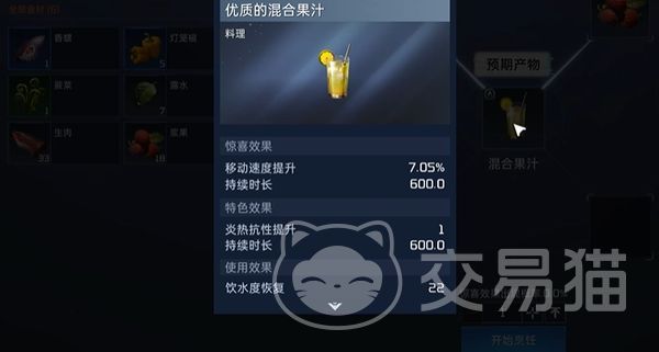 就比如浆果和露水制作成的优质混合果汁,在玩家使用后可以将自己的移速提高7.05%,并且能持续600秒,它的特色效果能够将角色的炎热抗性时间提升到600秒,饮水度恢复22。如果使用的材料不是特别好的话,那么它所带来的效果就会没有这么高哦。