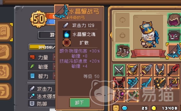 水晶蟹战弓:这把弓箭是前中期就能够轻松获得的,不过它的性价比确实很高,首先50级的基础攻击就有129,然后羁绊水晶蟹之魂可以增加额外的技能冷却缩减,以及debuff的施加成功率,再配合另一个“扩散”的羁绊正好能让你的那些负面状态技能有更多发挥空间。