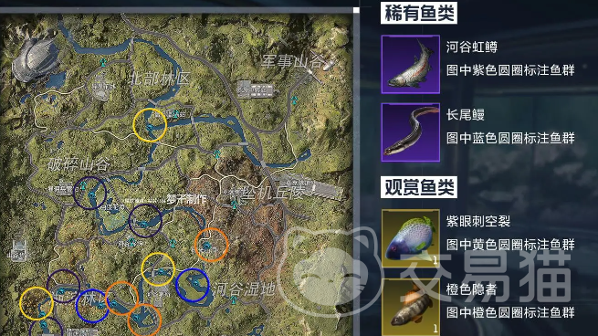 【长尾鳗】【河谷虹鳟】掉落地点:杜加河谷水域附近的稀有鱼群,(590,366)、(1133,506)/(352.439)、(539.983)