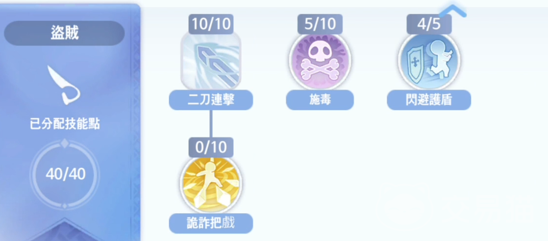 如果玩家们药水储备不是很够的话,是可以先不着急去点施毒,而是先点残影。残影本身可以永久提高闪避值和移速。满级的残影可以提供30点的闪避值,同时还增加玩家5%的移动速度。这个闪避值在对付一些命中不是很高的敌人是有着很不错的效果。在点满之后盗贼可以前往海底进行练级。之后点满藏匿和闪避护盾。闪避护短也可以只点到4级。这两者都是用来潜行和提高生存来使用的。最后点上后退回避盗贼技能加点就完成了。