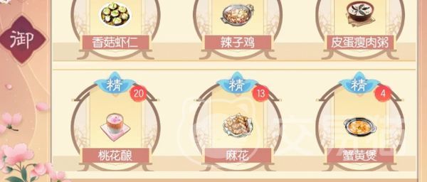 东坡肉食材也和上两种差不多,是豚肉和糖霜粉,不过它最后一个食材既不是佐料包,也不是醋,而是秋油。残花云梦肉需要豚肉和佐料包即可制作完成。桂花醉鸡需要大家获取玉酝,桂花以及鸡肉,而桂花酱鸡则是需要桂花,鸡肉和秋油。