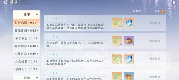 大家可以在游戏主页中点击异事,然后就可以查看里面的各项任务,比如同游大胤,神鬼异闻以及家国天下等,里面又分成了许多小任务。