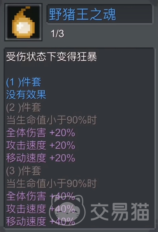 野猪王之魂:这是南部草原boss野猪王系列装备的羁绊,野猪王也算是玩家很早碰到的一个boss了,它的羁绊效果简单有效,两件套可以将全体伤害,攻速和移速各自提升20%,不过有个血量低于90%的触发条件,而凑齐三件套后,这个触发条件仍然不变,不过各项属性的加成比例提升到了40%。它对于各种职业都是十分适用的,因为全体伤害和移速不管对物伤职业还是法伤职业都很有用。