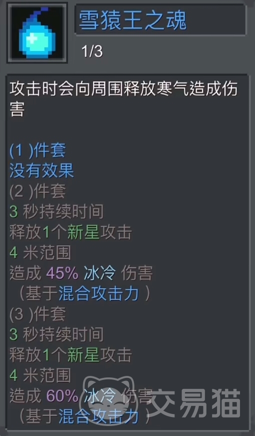 雪猿王之魂:这一羁绊出自boss雪猿王的系列套装,它的羁绊效果是通过攻击向周围持续释放寒气来造成伤害,这个寒气攻击的持续时间与伤害范围在二三件套的时候都是不变的,不过它的伤害加成倍率会根据羁绊的凑齐程度有45%和60%的区别,另外该伤害属于冰冷伤害,对于部分属性的敌人存在较为明显的克制效果,而且该伤害可以享受混合攻击力的加成!