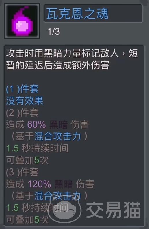 瓦克恩之魂:这是地图副本的最后一个boss瓦克恩系列套装所提供的的羁绊,它的羁绊可以通过黑暗力量标记敌人,并于短暂延迟后造成额外伤害,标记的时长与最大标记次数在二三件套的时候都是不变的,不过它的伤害加成会有60%~120%的变化,同时该加成看重的是混合攻击力,所以适用性非常强,另外它提供的黑暗伤害对于大部分的怪物都有不俗的克制作用!