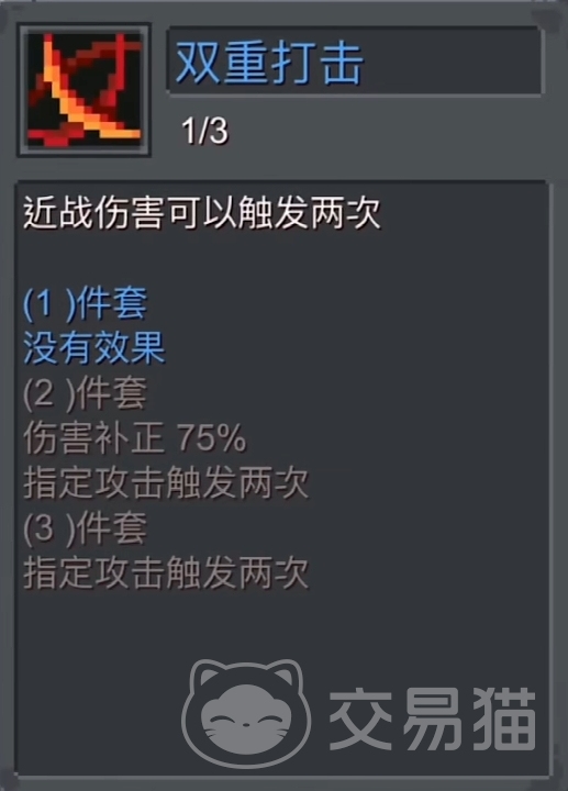 在装备羁绊的选择上,有三个是必须要凑齐的,第一个是双重打击,最低要凑两件套,它可以让你的近战伤害触发两次,第二次虽然只有75%的伤害,但旋风斩正好可以高频率触发,所以整体伤害也不低。