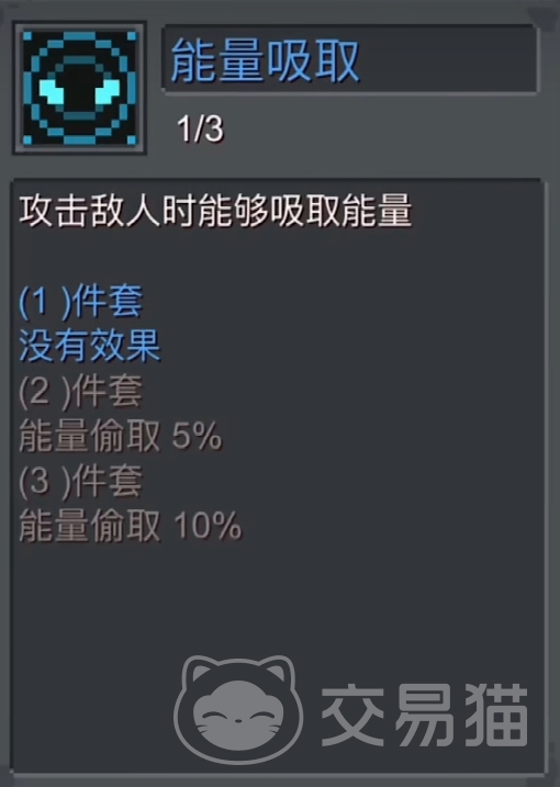 第二个需要凑的羁绊是“能量吸取”,它可以让你在攻击敌人时吸取能量,这个能量吸取效果在二件套和三件套的时候都十分不错,不过建议还是直接凑满三件,10%的能量偷取配合技能窃法之刃可以让你在持续释放旋风斩的过程中完全不缺能量。