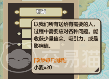 每一个代理点附近都有很多村庄,这些村庄能生产出基础物资,包括小麦等,我们布施需要消耗大量小麦。一开始时候只有布施这一项政策,升级之后才会出现收编、寻珍和劳作等。其中收编消耗影响力比较多,每天要消耗200点才能使用,而后根据触发事件不同结果确定进度,当进度达到2 0时就意味着完成。收编结果就是将代理一点里面其他所有门派全部踢出去,我方就成为该代理点唯一拥有者,自然也就获得了大量信仰人口。其他事件例如劳作每天需要消耗20的影响力,能够获得大量基础物资,寻珍可以获得一些比较稀有的珍宝等。