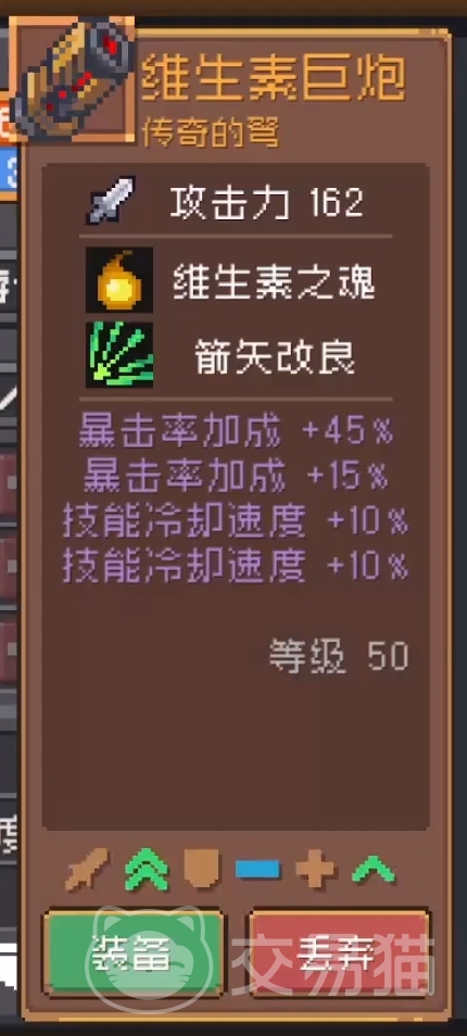 维生素巨炮:它在所有维C武器中,提供的攻击力属性是最高的,在50级未经强化的状态下就能给到162的攻击,而且提供的那些附加词条也都非常给力,其中包括两项暴击率加成和两项技能冷却速度的加成,两者结合之下你无论是普攻的输出效果,还是技能的输出效果都能达到顶峰。