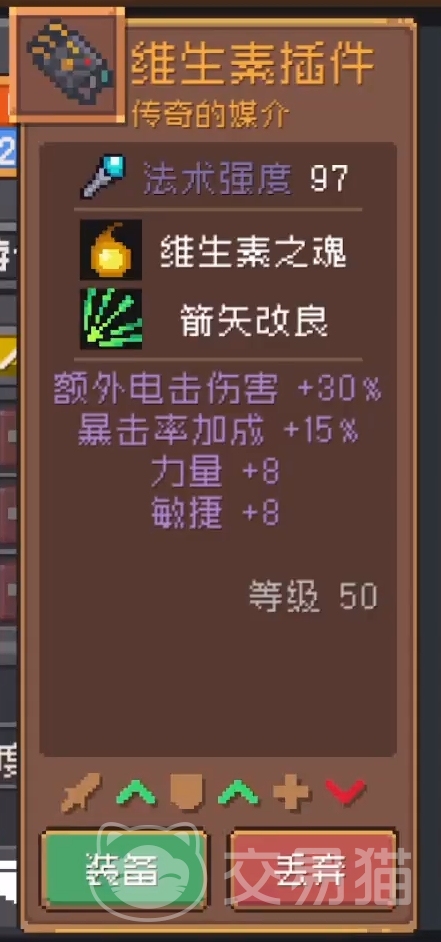 维生素插件:这是适用于法师角色的一个武器,因为它的基础属性与前面三个都不一样,提供的是97点法术强度,如果你的职业正好是法系职业,那么技能就可以全盘享受到这些法强的加成。
