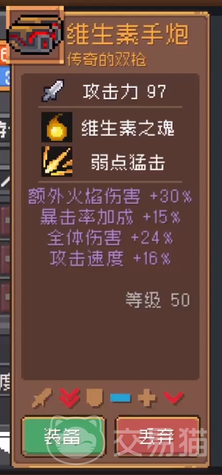 维生素手炮:这个是维C系列中最经典的一把武器,它是一把远距离的双枪,很适合射手或者游侠职业去使用,虽然攻击力只有区区97,但羁绊却有“维生素之魂”和“弱点猛击”这两项,其中前者可以提供攻速,移速与蓄力速度的全面加成,后者则能够提供暴击几率与暴击伤害加成,三件套更是最多能给到60%的倍率,角色的爆发因此大大提升。