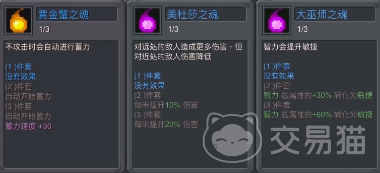 最后一种羁绊就是boss系列的羁绊,根据不同boss也有不同的命名,它们的效果没有定数,有的加属性,有的则提供功能性支持,其中美杜莎之魂就是一个典型的远程增伤羁绊,而大巫师之魂则是直接增加大量敏捷,至于黄金蟹之魂则更加偏向功能性,可以在不攻击时自动蓄力。