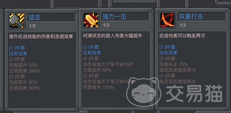 首先是增伤类羁绊,这些羁绊的效果都十分纯粹,凑齐一定数量的套装之后就可以让你的角色获得伤害提升效果,不过作用的范围各有不同, 比如“猛击”它提升的就是近战技能的伤害和击退效果,而“强力一击”则提升的是对满状态敌人的伤害,而像“双重打击”这种就比较特殊,它是通过增加攻击次数来提升你的近战伤害,并且两件套时第二下伤害会有一定衰减,需要全部凑齐才能发挥100%的伤害。