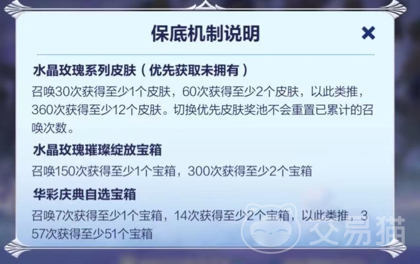 此外,本次皮肤抽取还有保底机制,每当玩家抽取30次,至少能获取到一个皮肤。同理,若是玩家抽取了60次,就能至少获得2个皮肤,以此类推。水晶玫瑰璀璨绽放宝箱也是如此,150抽可至少得到一个宝箱,300抽得两个,华彩庆典宝箱则是7次召唤至少的一个,357次召唤可拿到51个。