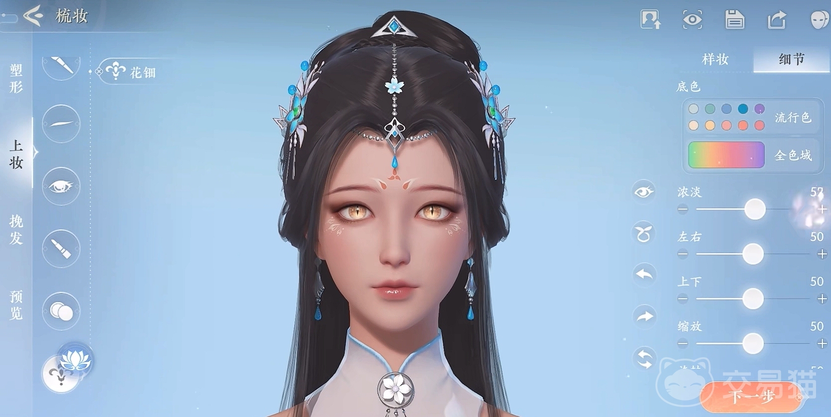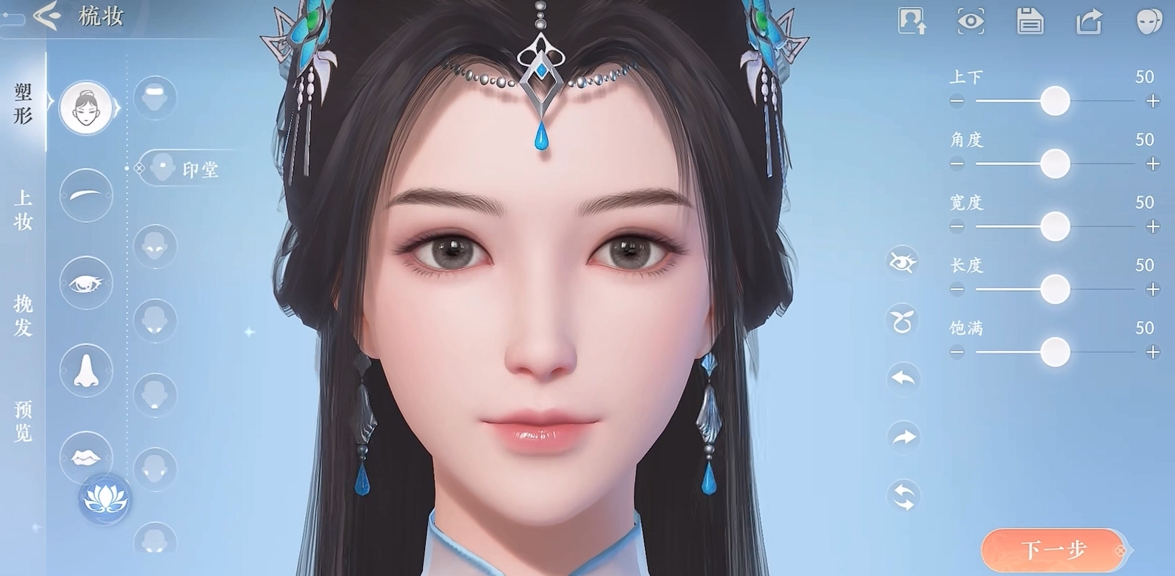 从基础的塑形方面,也包含了额头,眉毛,眼睛,鼻子,嘴巴等细微方面的调整,每一个都有数十种方向的选择,并且搭配的上下角度宽度饱满度等等系列的更改。这边比较推荐各位玩家们,优先对于眼睛,眉毛等重要地点的修正,之后再进行妆容的修饰即可。