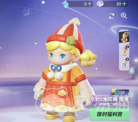 【米花娘·爆爆】这款皮肤就比较元气了,而且跟皮肤名字非常的贴合,穿起来就好像是爆米花成精了一样,整体采用的是红色和黄色进行搭配的,而且头发的设计,非常像是爆米花爆开的样子,头上的帽子元素,使用的是爆米花桶的红白薯条设计,角色还有两个白色袖套,在搭配上红色的小围裙,真的是软萌软萌的!目前这款皮肤一共有三个颜色,红白,黄白和蓝白;
