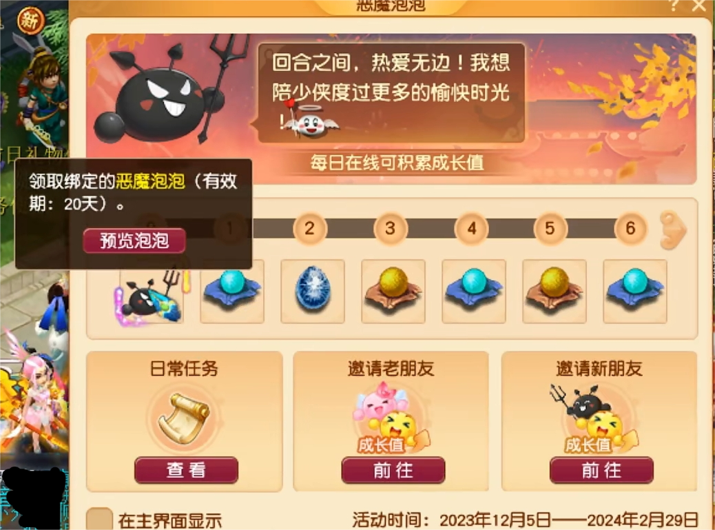 此外,恶魔泡泡的活动时间不是永久性的,大家需要在2023年12月5日~2024年2月29日这段时间内将其解锁,否则后续就没机会参与该活动了,当然,后续你也可以前往这个活动所在区域找到附近和恶魔泡泡长相相似的npc,这样你可以培养和喂养自己的恶魔泡泡,从而使它变强。。