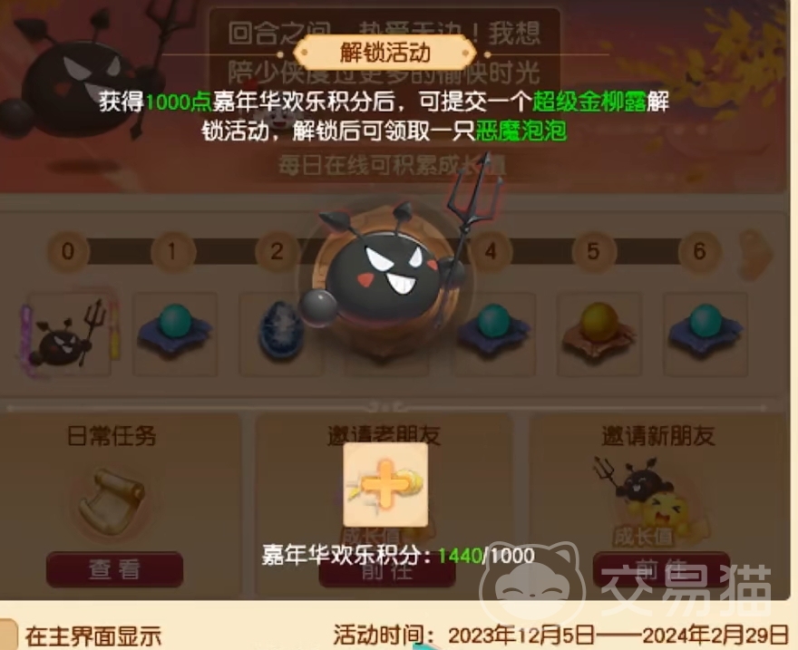 获取恶魔泡泡需要满足两个条件,第一个条件就是首先参与嘉年华活动,然后通过完成活动中的任务指标来赚取1000点欢乐积分,积分达到以后再去提交一个超级金柳露即可解锁恶魔泡泡的相关活动。