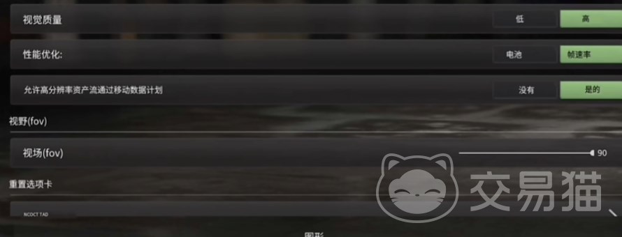 进入游戏后从右侧进入设置界面,找到图形,可以看到有几个基础选项,视觉质量、性能优化、是否允许高分辨率资产流式传输计划、视野fov以及重置选项自。可以看得出游戏并没有给出太多复杂可调的选项,游戏的画面是根据装备自适应的。