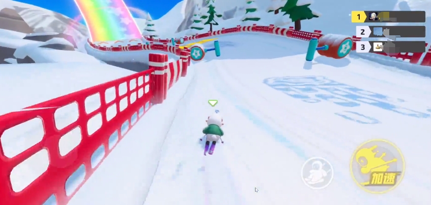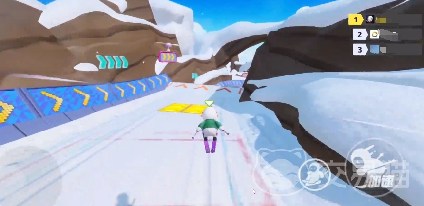 值得一提的是除了缤纷雪球以外,游戏内还有其他的障碍物,它们的体型相较于雪球会更大一些,所以也要一并躲避一下,除了躲避障碍外还需要学会借助地形加速,具体的方法就是往左右两边的加速板靠近。