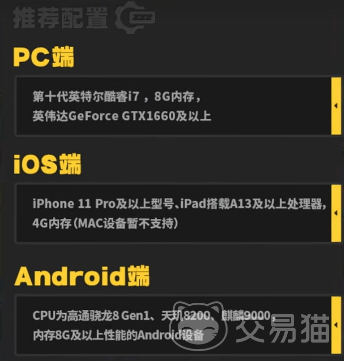 上一次测试的时候,游戏的配置就已经公布出来了,PC版的话,最起码要十代英特尔i7处理器加8 GB的内存,以及英伟达GTX 1660及以上的显卡。至于许多玩家们关注的手机版,苹果设备最起码需要拥有4g的内存以及a13以上的处理器,至于安卓玩家的话,则需要高通骁龙8g1或者天玑8200、麒麟9000以上的CPU,外加8GB的内存。