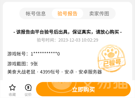 在交易猫中我们可以看到有一些账号会带有验号标识,平台的客服会进入游戏中为我们进行一些信息和内容的验证并且将相关的截图贴出来,用这种方法就能够保障账号的真实性。在商品详情页面中大家也可以直接向卖家来出价,一般来说小刀都是可以接受的,可以让我们用比较低的价格入手。当然如果有平台积分的话,用来抵扣也可以获得一定的优惠额度,还是比较不错的。
