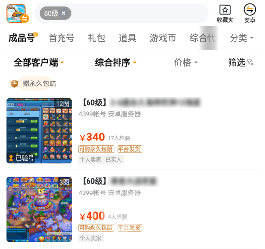交易猫中就有海量的游戏账号供大家选择,这款游戏60级就封顶了,达到这个等级基本将游戏中的炮塔角色全部解锁了,我们直接在平台中搜索60级就可以快速挑选出相关的商品。经过比较大家可以看到,60级的账号基本都是在300-500左右,根据包含的高等级炮塔和战力排行有一定的浮动。如果大家想要某一款炮塔角色也可以直接搜索来快速定位,可以非常方便地找到大家想要的账号。