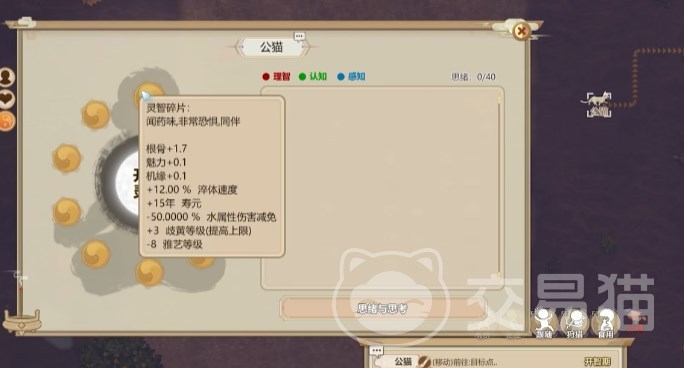 买了后让门内的弟子去学,随后对收服成功的动物随便用一个技能,就可以将这个动物直接启智了。之后就是关于灵智碎片与培养,可以买只猫给它安排一个可以思考的地方,随后将其作为代理来提升灵智碎片获取的速度,3个碎片就可以开灵智了。