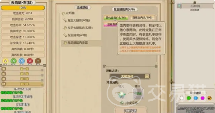 天盾腿的后腿肌肉需要使用风水灵机来进行淬炼,这个精华只能够在大吉的房间当中吐纳去获得,所以需要先打造一个风水大吉的房间,满足这个条件的话,进行吐纳就可以得到这种精华了,虽然获得效率还是比较低,但是也是最好的方式了。